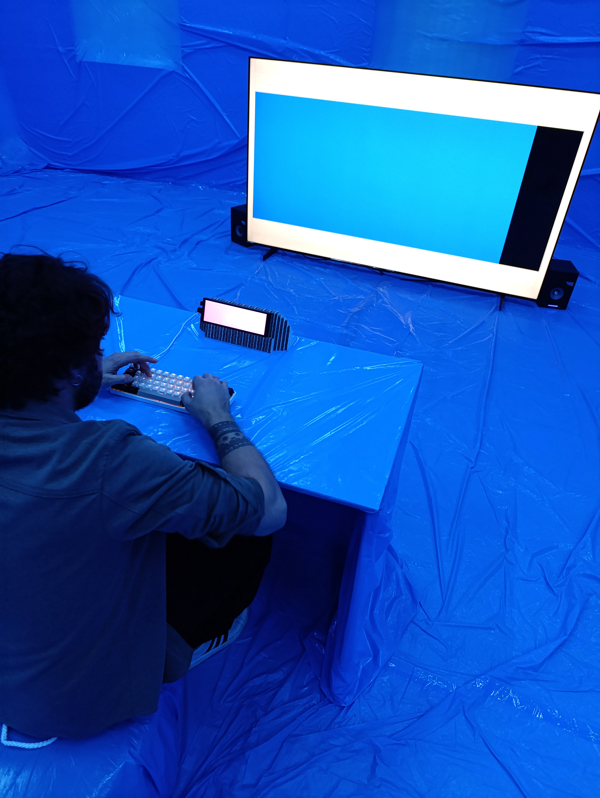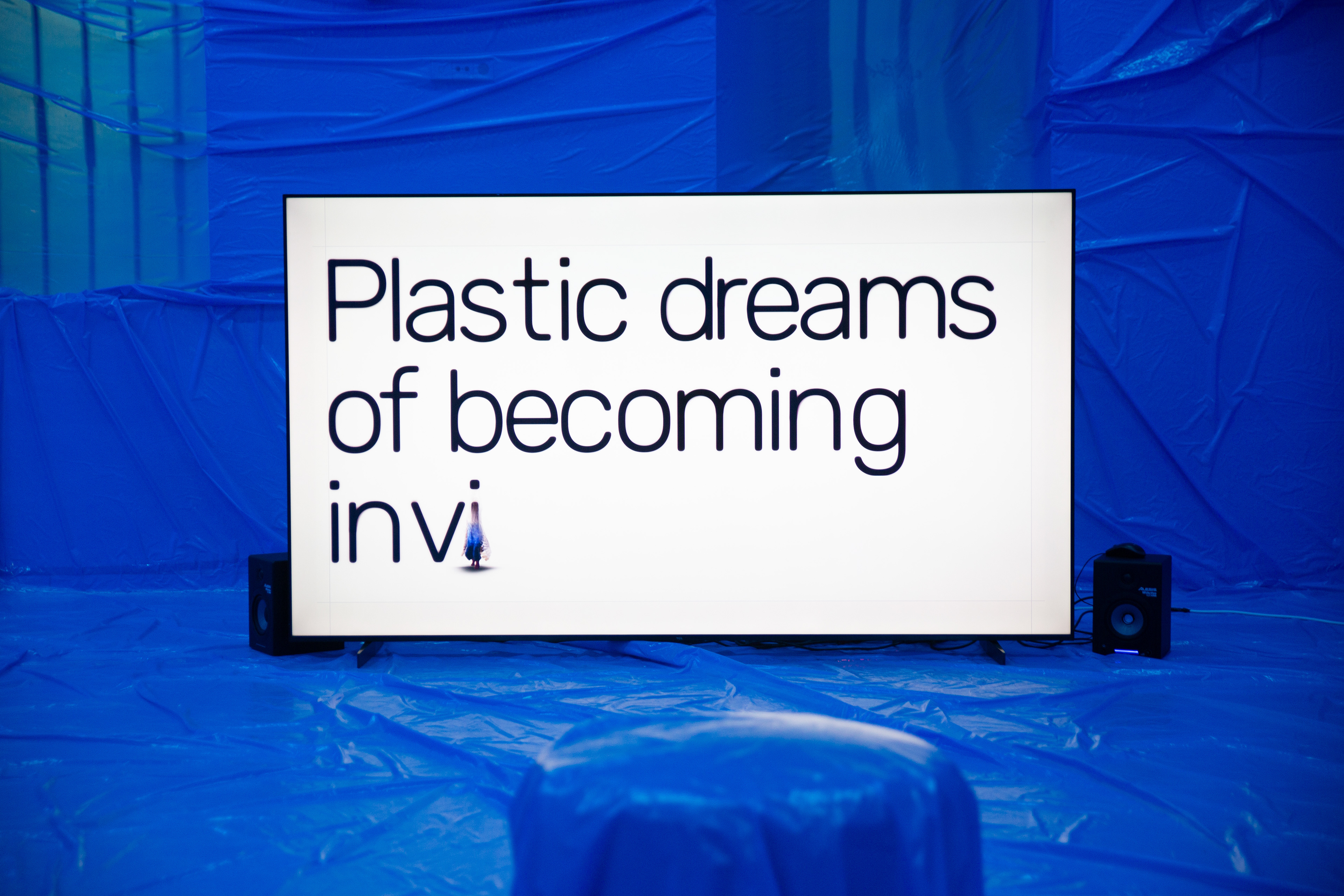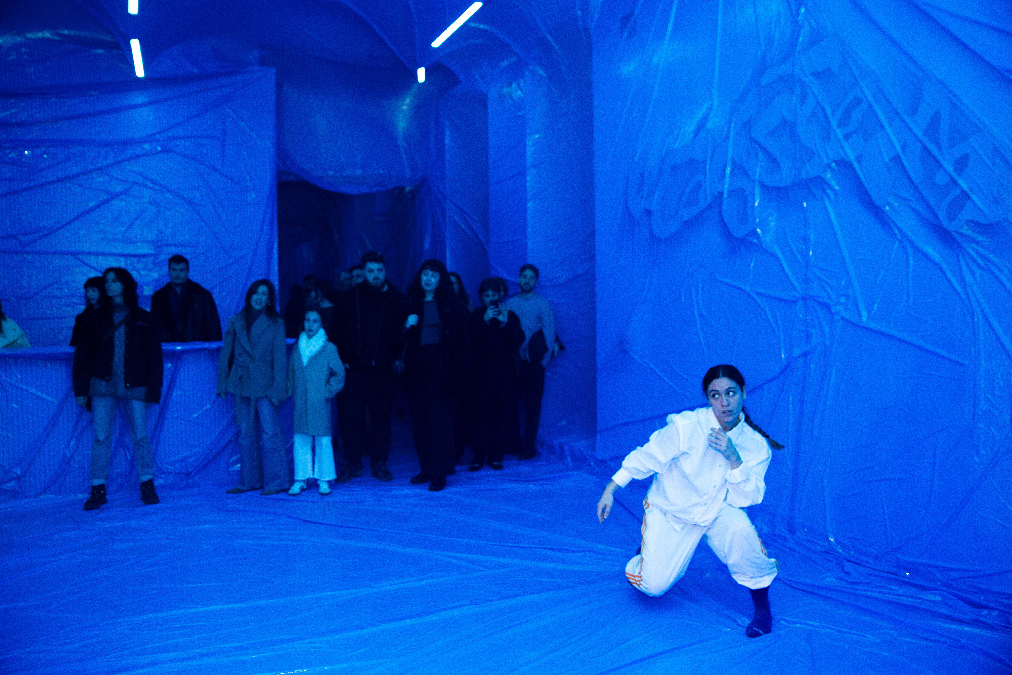 El dispositivo puede ampliarse mediante una performance en vivo, ya sea con la bailarina original del proyecto (Carla Sisteré) o con un/a performer local que improvise a partir de los textos generados en directo.