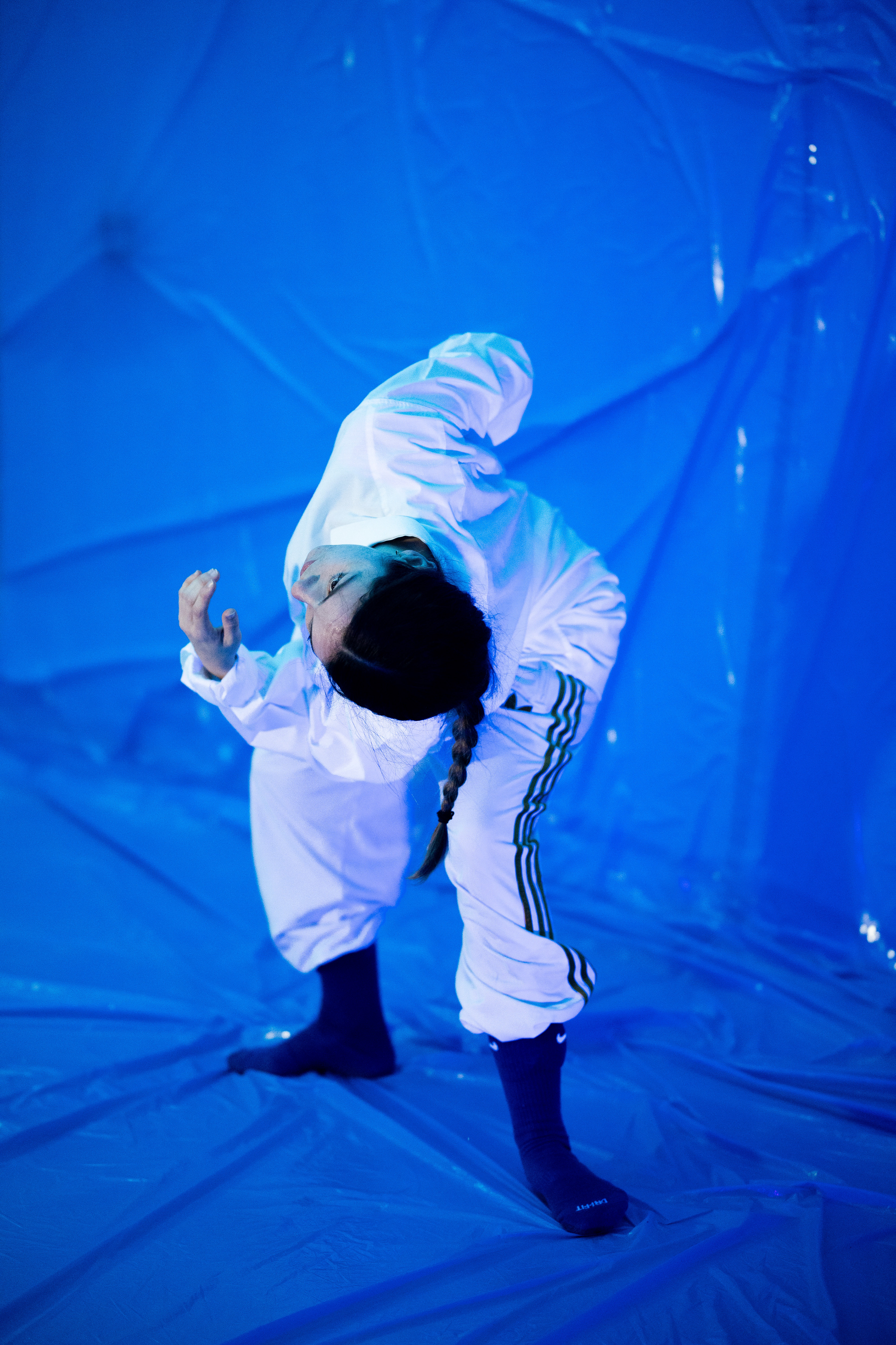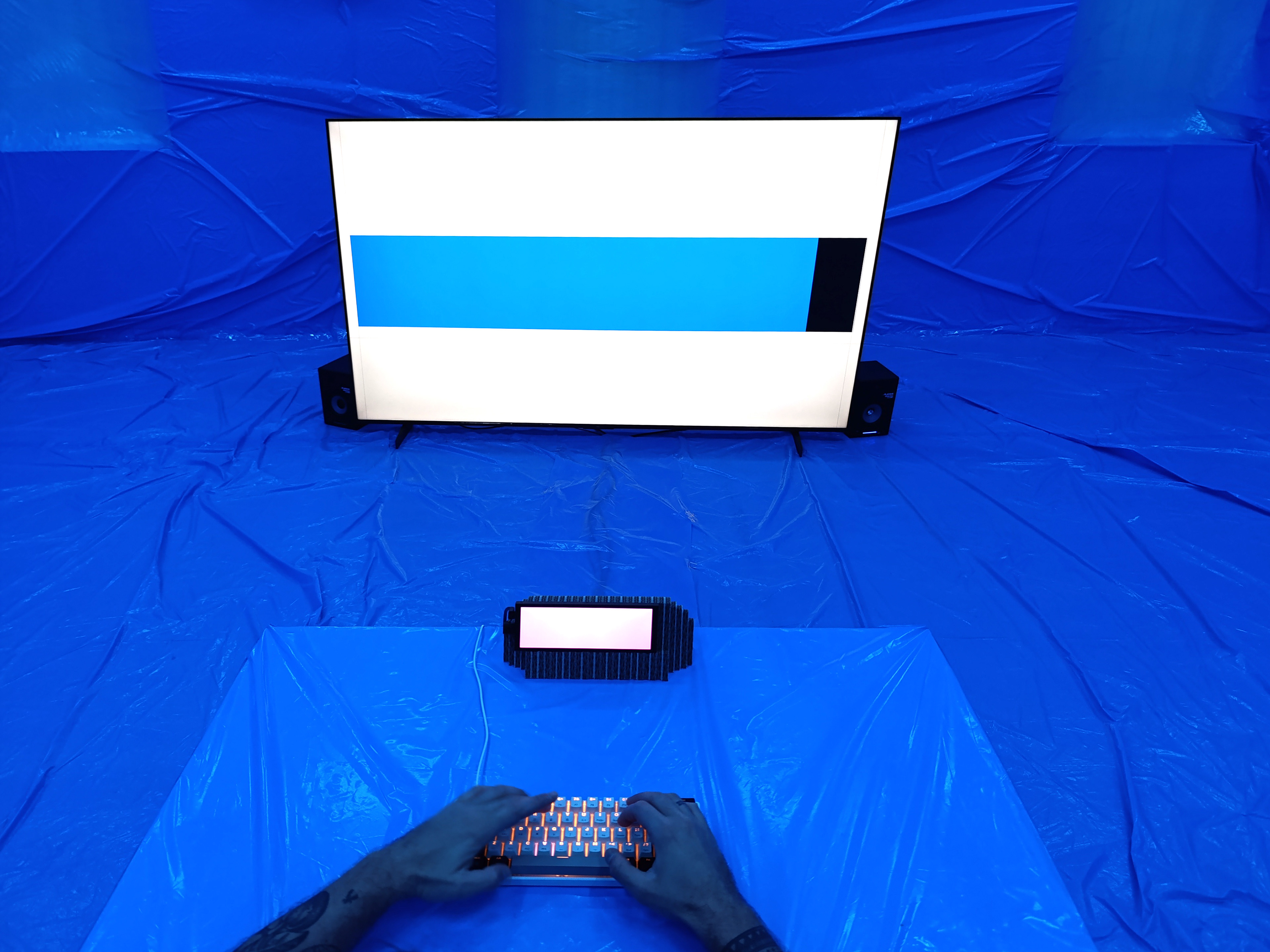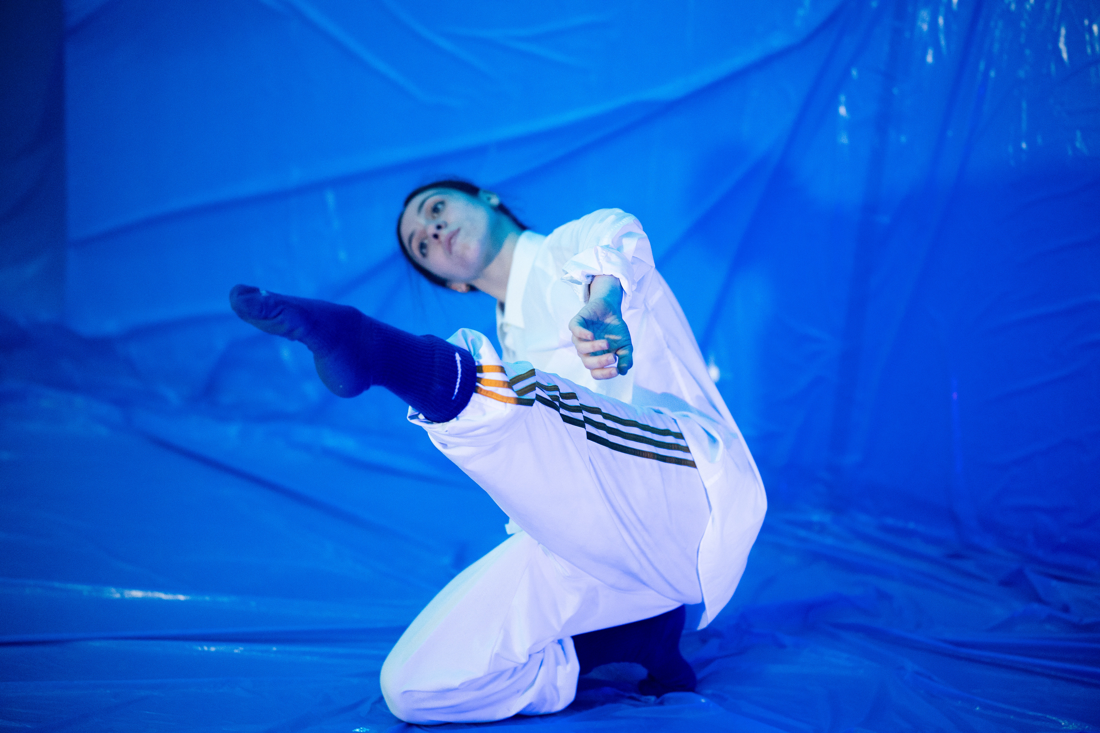 El dispositivo puede ampliarse mediante una performance en vivo, ya sea con la bailarina original del proyecto (Carla Sisteré) o con un/a performer local que improvise a partir de los textos generados en directo.