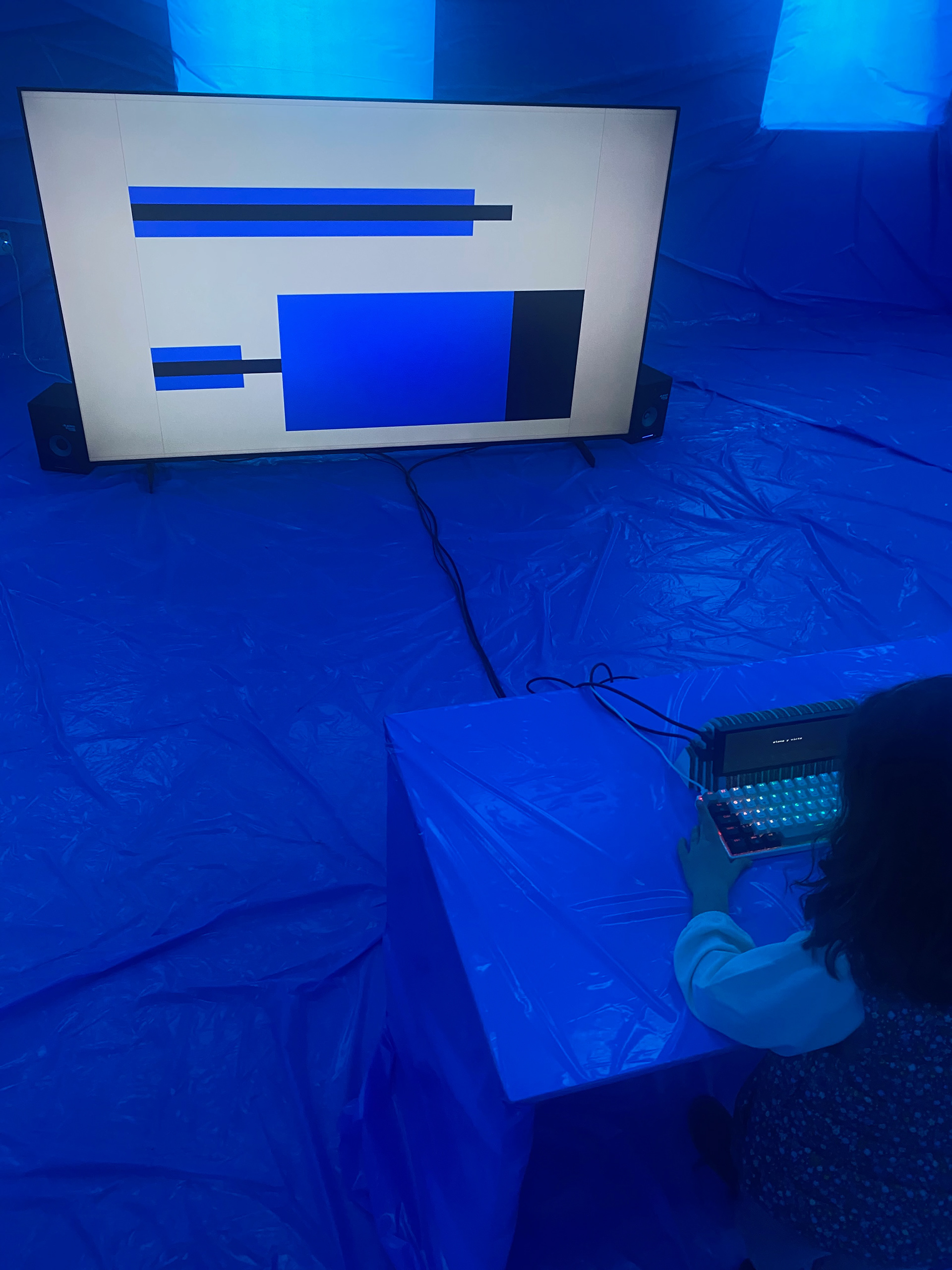 Durante la presentación en Murcia, las letras y palabras se proyectaban sobre el cuerpo de la intérprete, generando un diálogo entre el cuerpo físico y el cuerpo tipográfico. Tras esta activación performativa, el sistema puede permanecer abierto como instalación interactiva, permitiendo que el público escriba, improvise, juegue o incluso se fotografíe como si se tratara de un fotocall coreográfico. De este modo, el sistema puede funcionar tanto como experiencia contemplativa como espacio lúdico y participativo.
