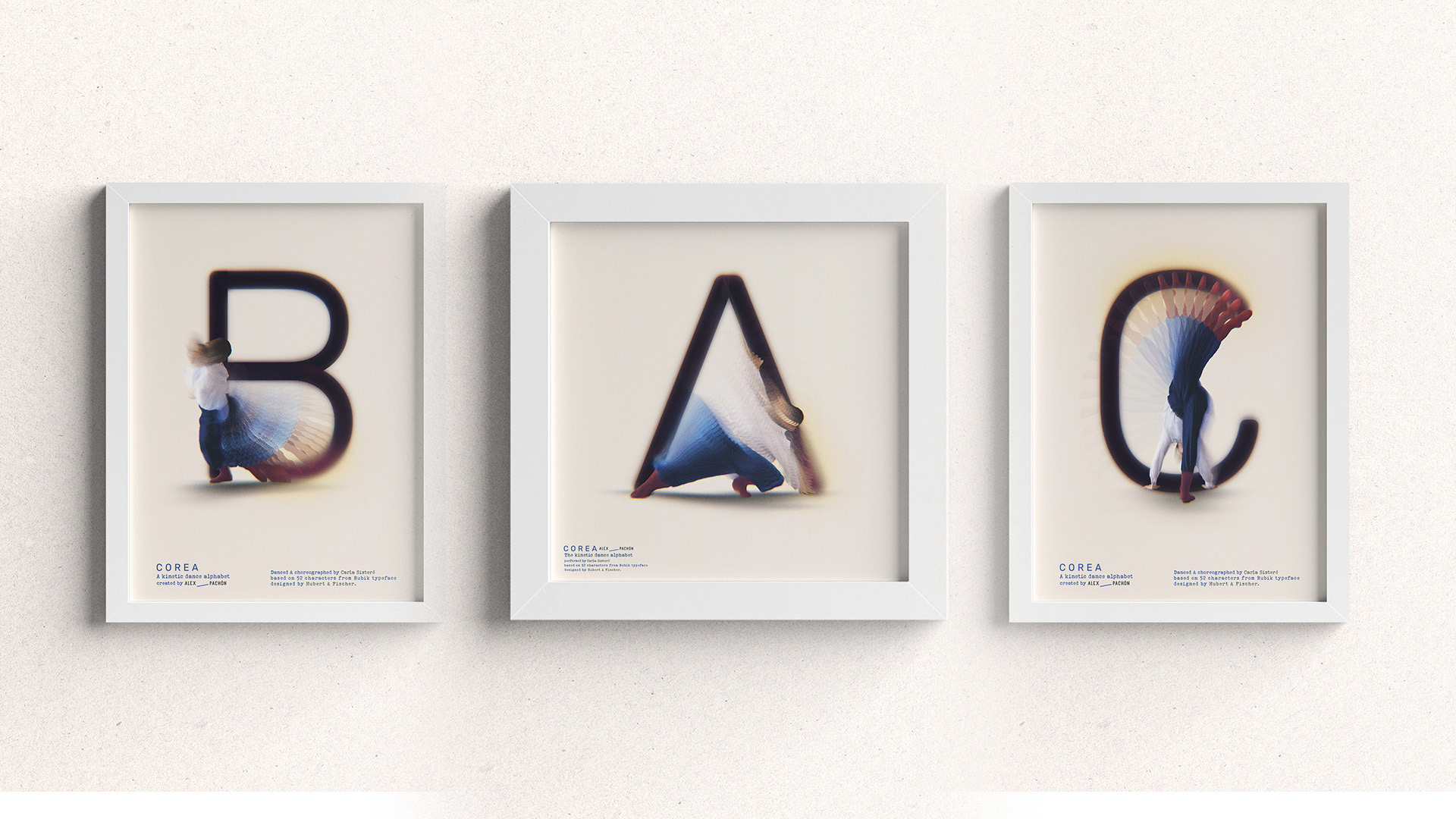 El proyecto puede completarse con una exposición paralela en la que las letras del alfabeto coreográfico se presentan individualmente en láminas enmarcadas, funcionando como piezas autónomas que combinan tipografía, cuerpo y composición visual. Este formato amplía su dimensión plástica y permite una lectura más pausada del sistema.